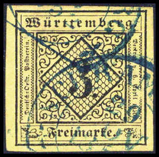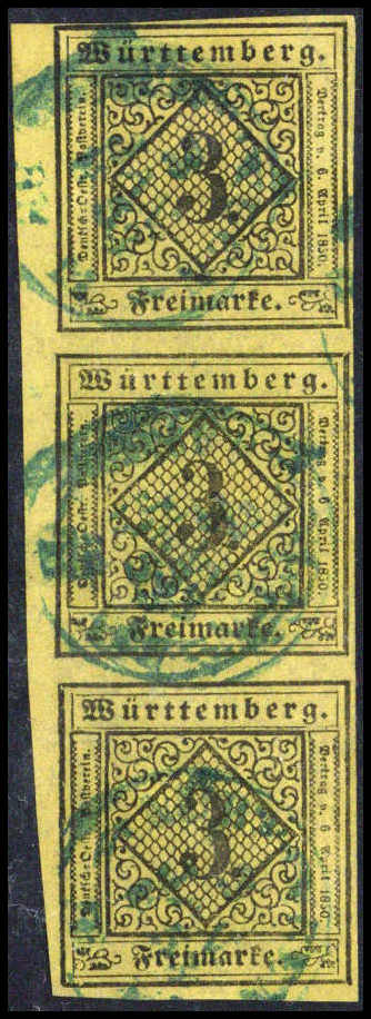 3 Kr. a. dunkelgelb, senkr. Dreierstreifen in den Typen IVa/III/IVa vom li. Bogenrand, blaue K2 TÜBINGEN 3/1 53. Ob. Marke kl. Beanstandung und etwas verblasst. Mit dieser Typenkombination eine außergewöhnliche Seltenheit, Fotoattest