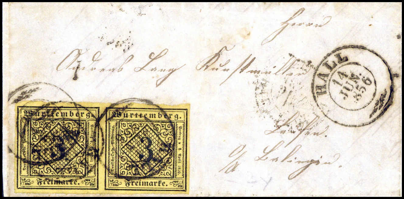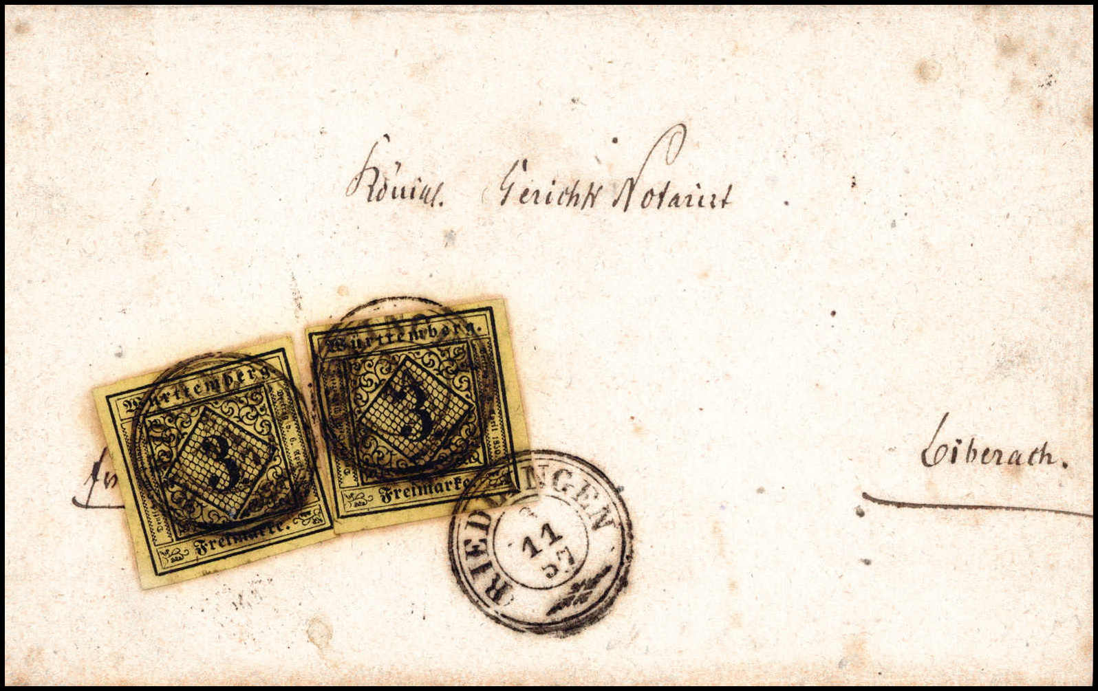3 Kr. a. ockergelb, zwei äußerst breitrandige Exemplare mit zentr. K3 RIEDLINGEN 8/11 57 auf Teilbrief nach Biberach (etwas unfrisch). Eine sehr seltene Mehrfachfrankatur, Fotobefund Heinrich BPP