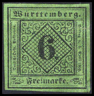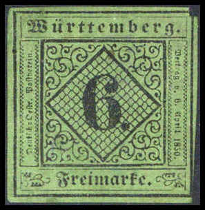 6 Kr. a. blaugrün, ein außergewöhnlich frisches, ungebrauchtes Exemplar, ringsum breitrandig geschnitten und mit Teilen des Originalgummis (unauffällige Mgl.). So dekorative Exemplare dieser Ungebraucht-Seltenheit sind kaum zu finden,