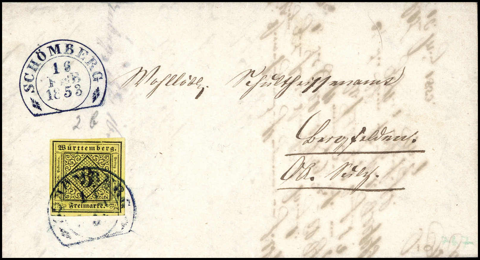 3 Kr., seltene Type IVc, Luxusstück mit leuchtend blauem Steigbügelstempel SCHÖMBERG 16/2 53 auf Brief nach Sulz, sign. Thoma BPP