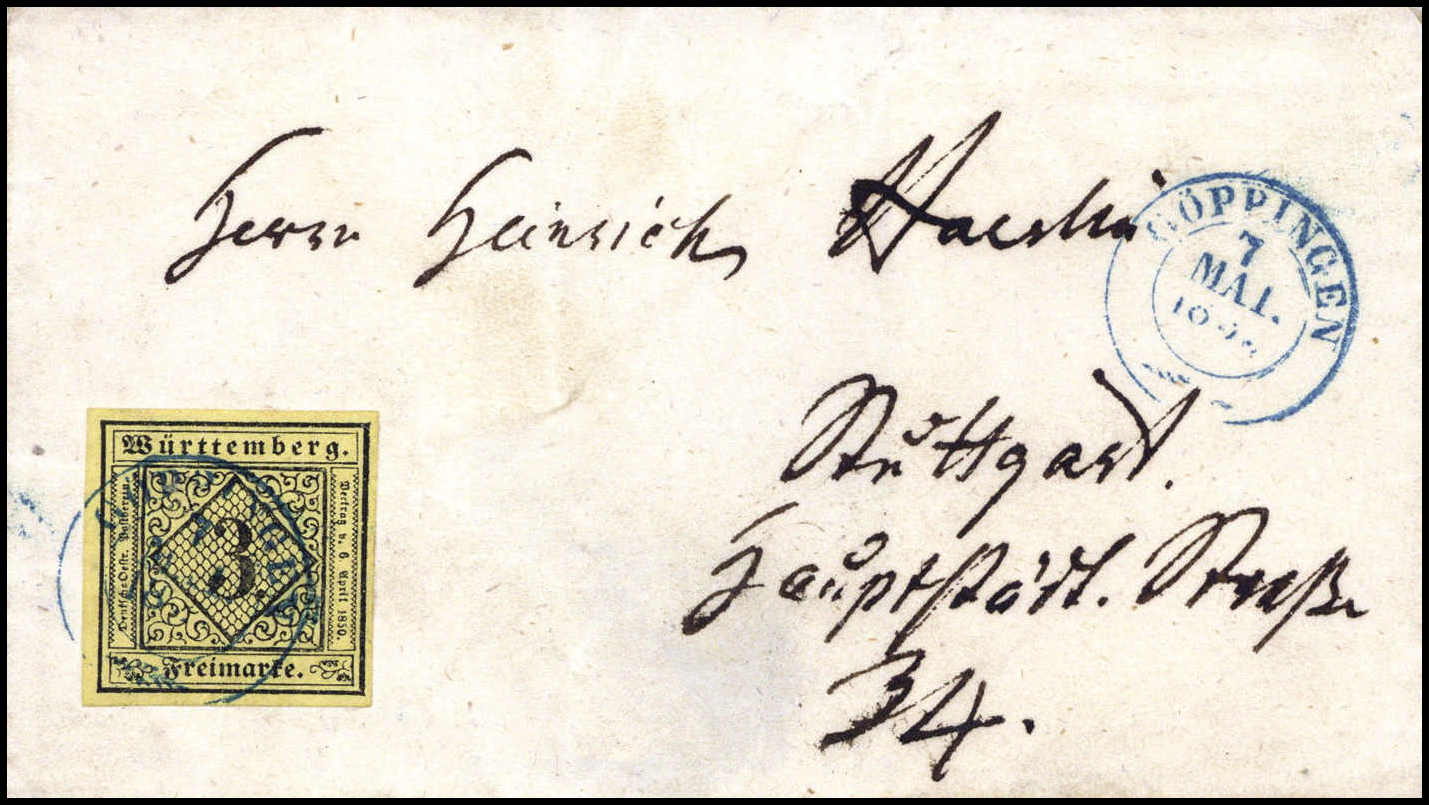 3 Kr. a. pastellgelb, breitrandig und leuchtend farbfrisches Luxusstück mit zentr. klarem K2 GÖPPINGEN auf kl., weißem Brief nach Stuttgart, Fotoattest Irtenkauf BPP. Katalogpreis: 1.000,-+