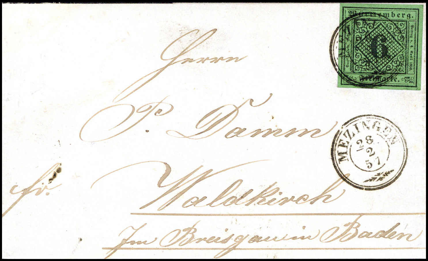 6 Kr., frischer Luxusbrief mit sauber aufges. K3 MEZINGEN