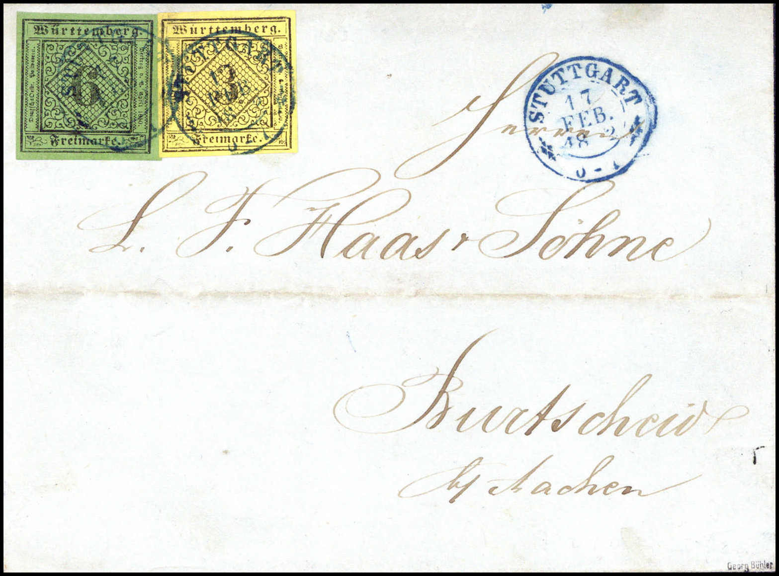 3 Kr. mit 6 Kr. a. grün, Luxusstücke mit zentr. blauen K2 STUTTGART auf gef. Brief nach Burtscheid, sign. Bühler