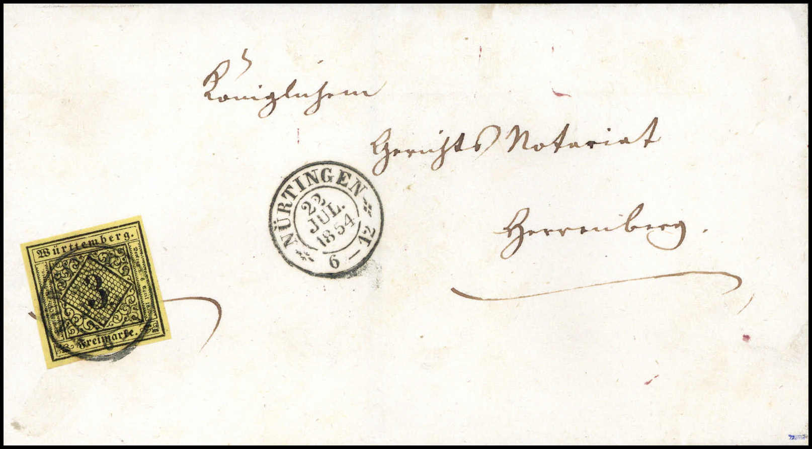 3 Kr., Seidenpapier, besonders schöner Luxusbrief mit idealem K2 NÜRTINGEN, sign. Irtenkauf BPP