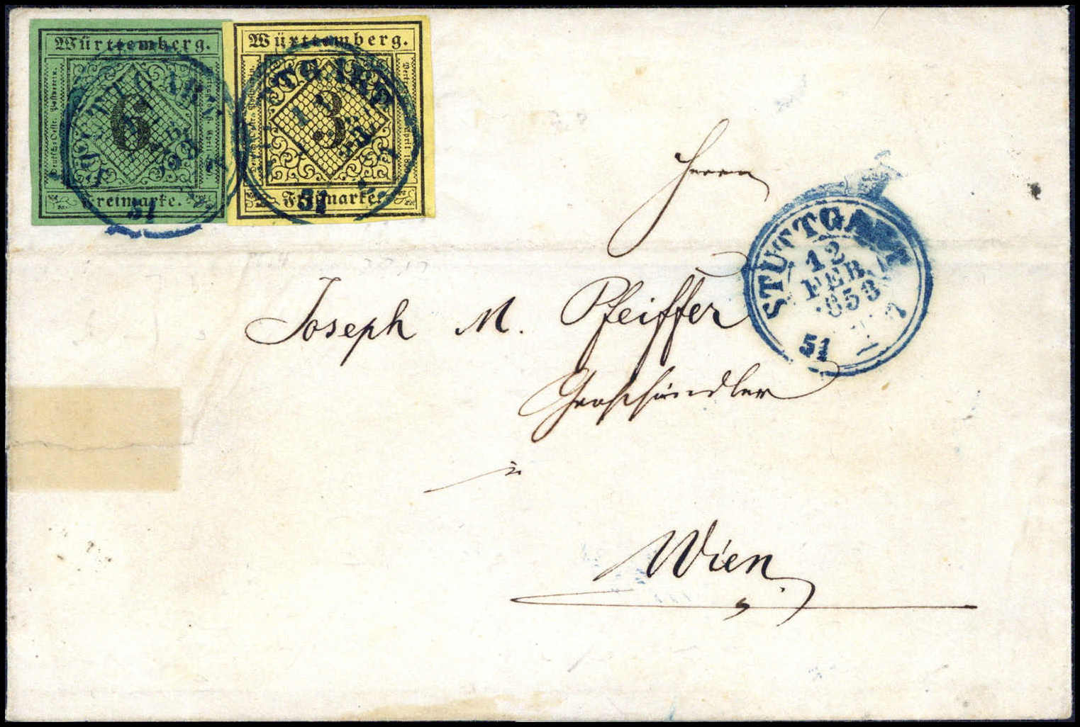 3 Kr. mit 6 Kr. a. grün, frische Kabinettstücke mit zentr. blauem K3 STUTTGART auf Faltbrief nach Wien (li. verklebter Einriss)
