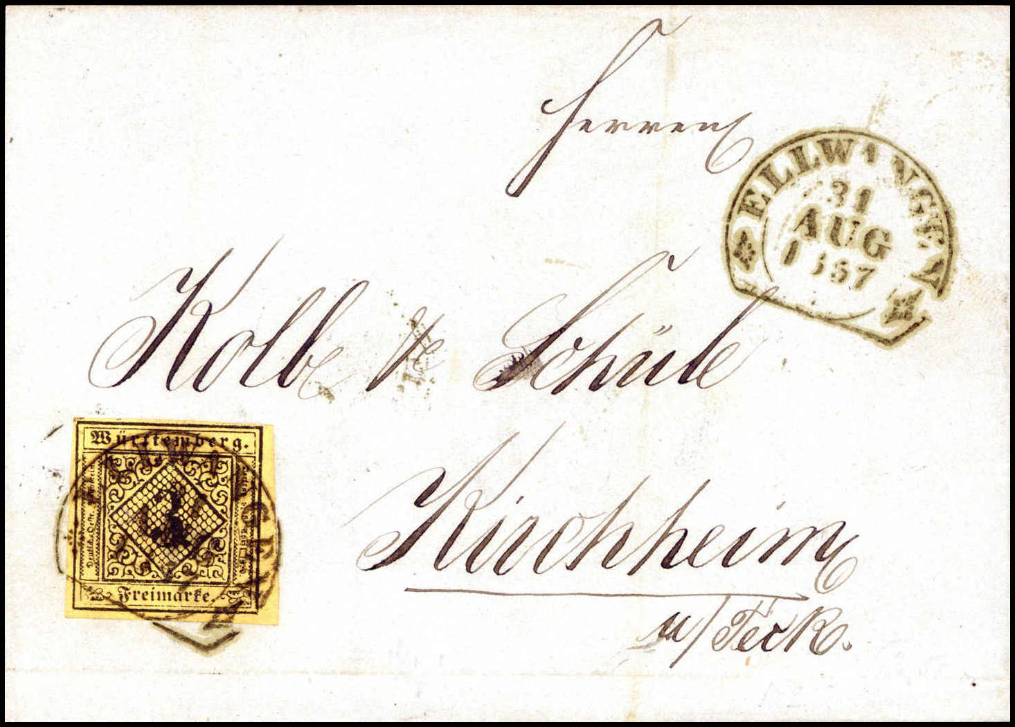 3 Kr. ockergelb, Luxusstück mit zentr. und klarem Steigbügelstempel ELLWANGEN 31/8 57 auf schönem kl. Brief nach Kirchheim/Teck, Fotobefund Irtenkauf BPP. Katalogpreis: 450,-