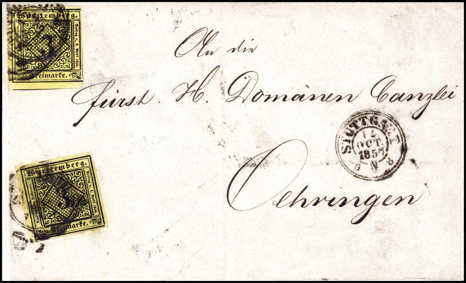 Mehrfachfrankatur 3 Kr. schwefelgelb: 3 Kr. a. schwefelgelb, zwei leuchtend farbfrische Exemplare, das untere ringsum breitrandig und in tadelloser Erhaltung, das obere etwas angeschnitten, auf schöner weißer Brief-Vds. mit K3 STUTTGART