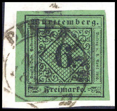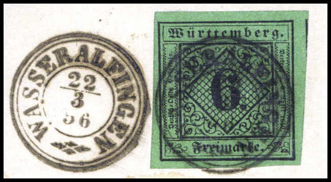 6 Kr., außergewöhnlich breitrandiges Luxusstück (re. kleiner Teil der Nebenmarke) auf Bfstk. mit zwei idealen K3 WASSERALFINGEN