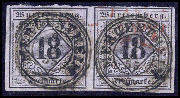 18 Kr., waagr. Luxuspaar, die li. Marke in Type II, die re. Marke in Type I, ringsum vollrandig und in besonders frischer Farbe. Jede Marke mit zentr. und gerade aufges. K3 MERGENTHEIM 9/8 55. Typenpaare der 18 Kr. sind nur ganz wenige