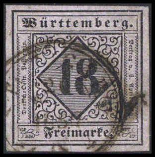18 Kr., breitrandiges Kabinettstück mit K3 STUTTGART, Fotoattest Heinrich BPP ("in besonders frischer Erhaltung"). Katalogpreis: 900,-
