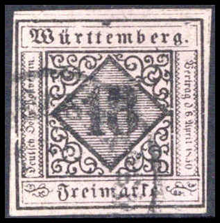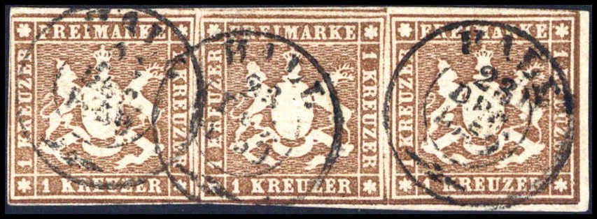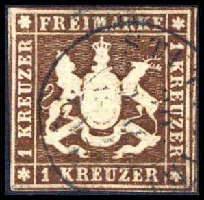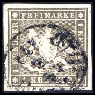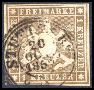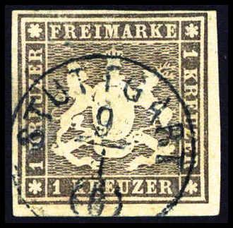 1 Kr. tiefdunkelbraun, Kabinettstück, für diese Ausgabe weit überdurchschnittlich geschnitten, klarer K2 STUTTGART. Selten, Fotobefund Heinrich BPP. Katalogpreis: 800,-