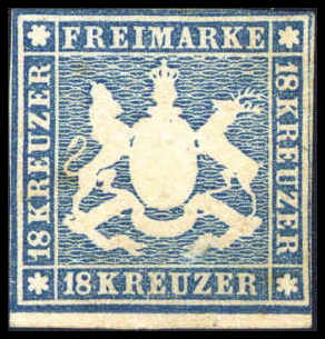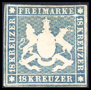 18 Kr. blau, frisches ungebr. Exemplar, üblich geschn. und mit kl. Nadelstich, vollständiger Originalgummi. Eine seltene Marke, sign. Thoma BPP. Katalogpreis: 4.000,-