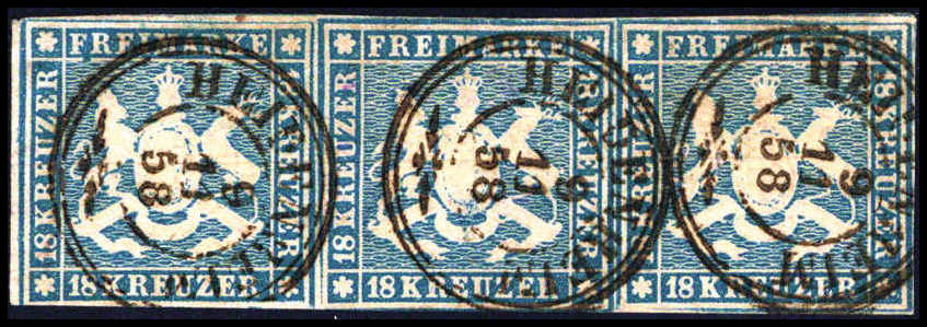 18 Kr., außergewöhnlich farbfrischer waagr. Dreierstreifen, für diese Ausgabe gut geschnitten (li. mit kl. Bogenrand) und sauber aufges. K3 HEIDENHEIM 9/11 58. Am Oberrand kl. Ausbesserung und winz. Eckbüge. Eine attraktive und seltene