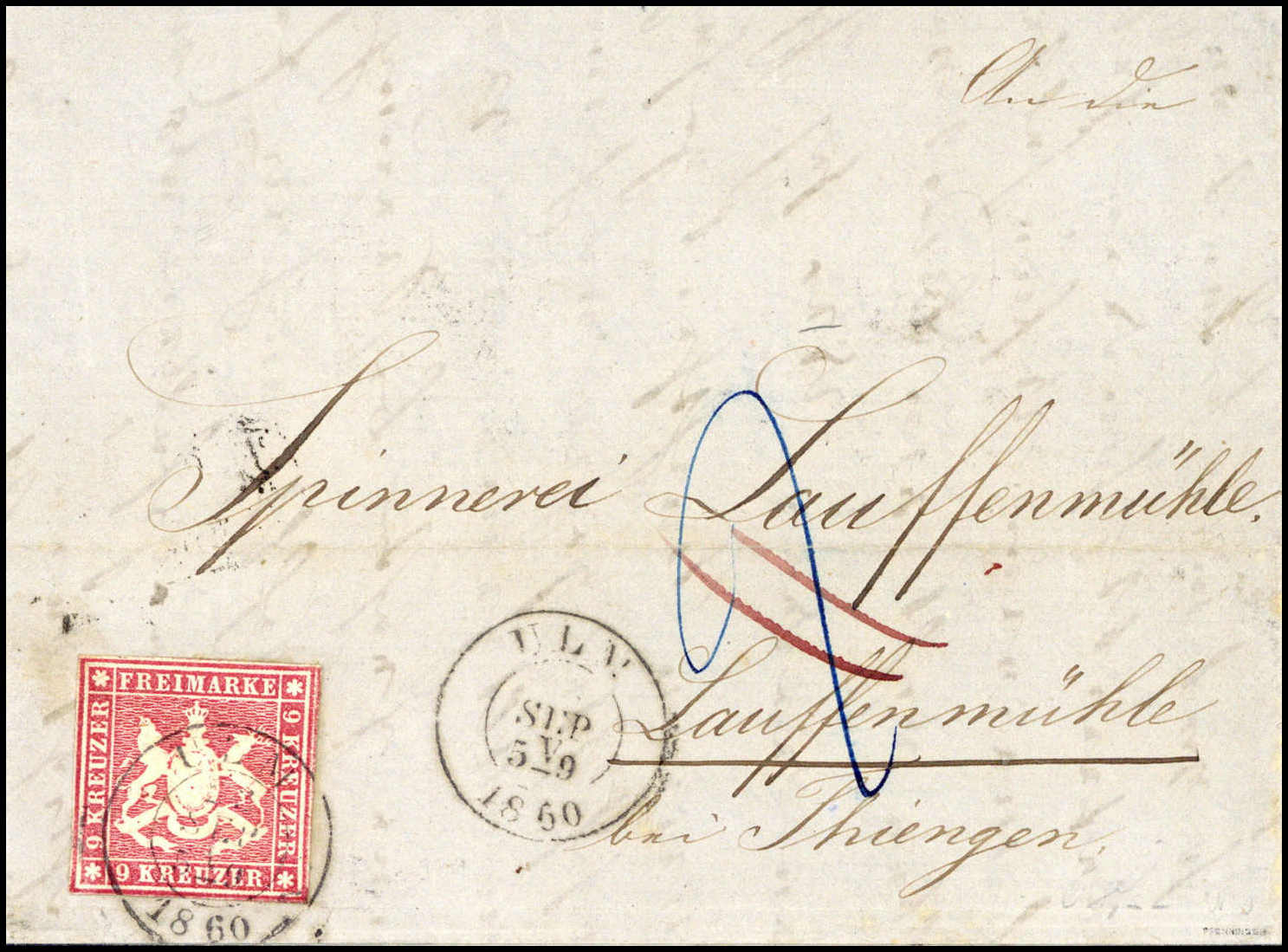 9 Kr., Kabinettstück mit klarem K2 ULM auf gef. Brief nach Lauffenmühle, sign. Pfenninger, Heinrich BPP