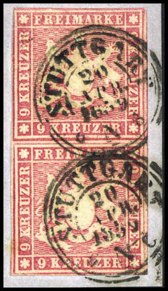 9 Kr. karminrosa, leuchtend farbfrisches senkr. Paar, bis auf kl. Stelle ringsum voll- bis überrandig geschnitten auf Bfstk. mit sauber aufges. K3 STUTTGART 20/4 59, Fotobefund Irtenkauf BPP ("ein schönes und sehr dekoratives Briefstück
