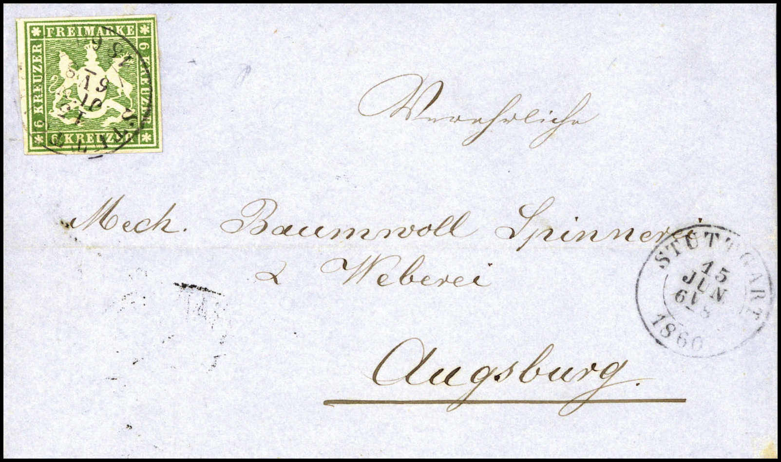 6 Kr. hellgelbgrün, schöne Nuance, Luxusstück mit zentr. K2 STUTTGART 7/3 60 auf schönem, rekommandiertem Faltbrief nach Augsburg, roter Kaminstpl. STUTTGART CHARGE beigesetzt