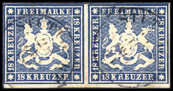 18 Kr. dunkelblau, vorzüglich farbfrisches waagr. Paar vom ob. Bogenrand (li. und oben etwas Randlinienschnitt) mit zentr. klarem K2 STUTTGART 29/6 61. Eine seltene Einheit, Fotoattest Heinrich BPP ("Insgesamt schöne Einheit der