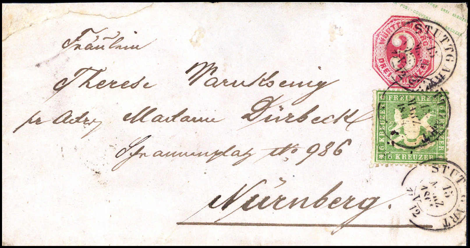 6 Kr., Zusatzfrankatur auf Ganzsachenumschlag 3 Kr. karmin mit klarem K2 STUTTGART nach Nürnberg (kl. Mgl.). Eine seltene Kombination, Fotobefund Heinrich BPP