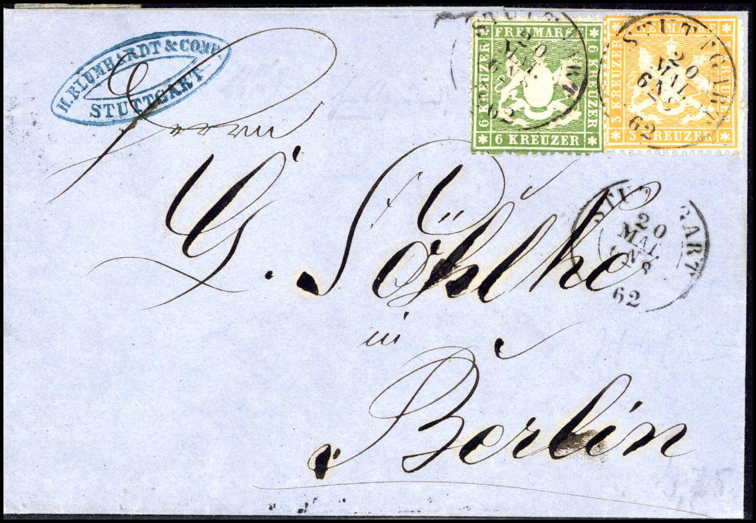 3 und 6 Kr., üblich gezähnte 9-Kr.-Frankatur auf schönem blauem Brief von Stuttgart nach Berlin, sign. Irtenkauf BPP