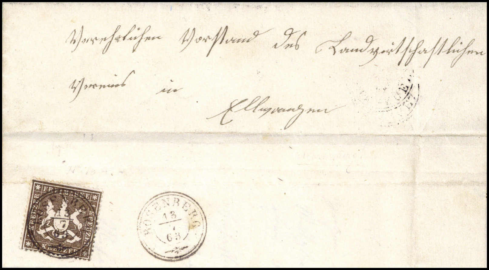 1 Kr., perfekt gezähntes Luxusstück mit ganz ideal aufges. K3 ROSENBERG 13/7 63 auf gef. Brief nach Ellwangen. Katalogpreis: 750,-