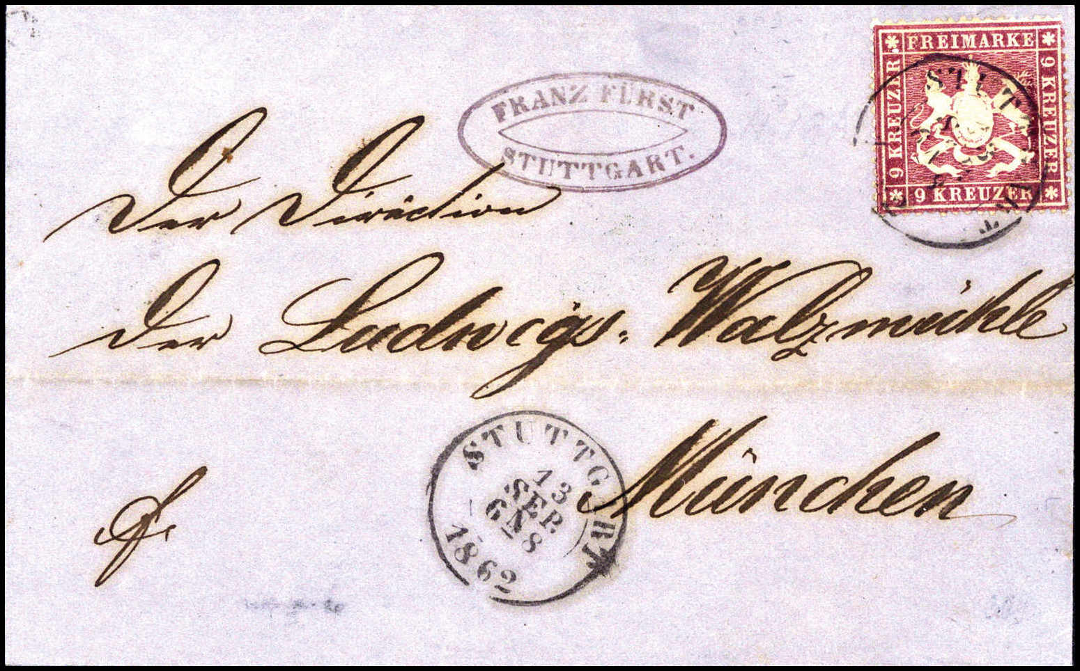 9 Kr., besonders tieffarbiges Kabinettstück mit sauber aufges. K2 STUTTGART 13/9 62 auf schönem blauem Faltbrief nach München. Katalogpreis: 900,-+