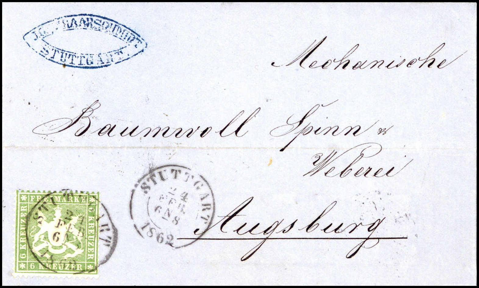 6 Kr., perfekt gezähntes Luxusstück mit K2 STUTTGART auf schönem, blauen Faltbrief nach Augsburg