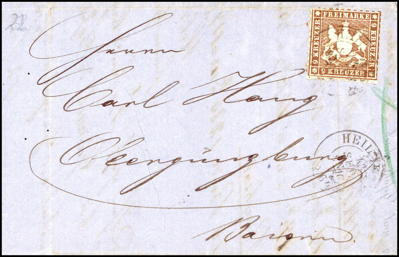 9 Kr., tieffarbiges Prachtstück mit klarem K2 HEILBRONN auf blauem Faltbrief nach Bayern, sign. Heinrich BPP. Katalogpreis: 650,-