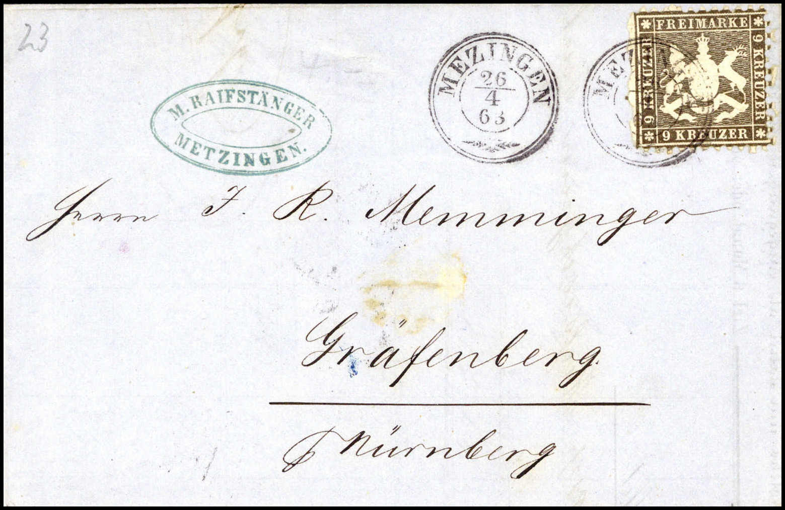 9 Kr. schwarzbraun, tieffarbiges Exemplar mit K3 METZINGEN 26/4 63 (li. Zahnfehler) auf schönem blauem Brief, doppelt sign. Heinrich BPP. Katalogpreis: 600,-