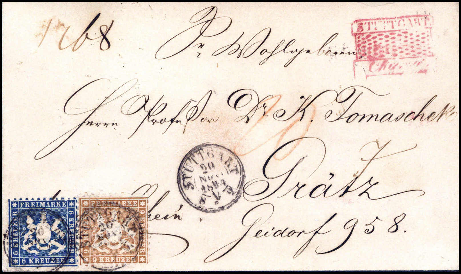 6 Kr. dunkelblau mit 9 Kr. gelblichbraun auf Kabinettbrief nach Österreich, zentr. K3 STUTTGART 29/11 64 und beiges. roter Kaminstempel