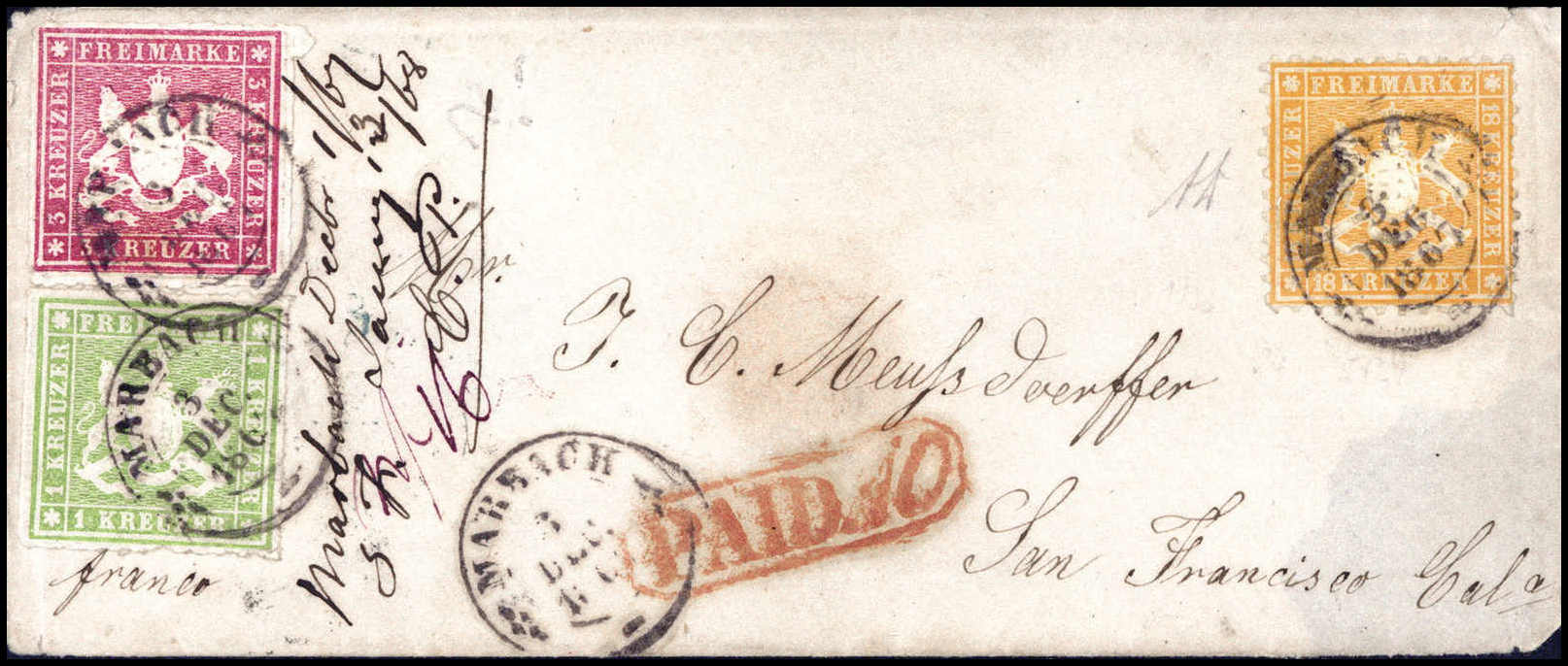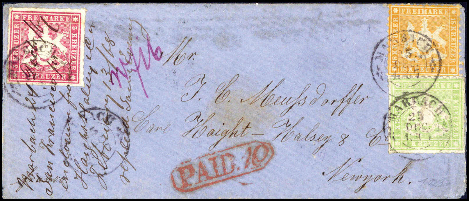 18 Kr. in Mischfrankatur mit 1 Kr. grün und 3 Kr. rosa auf kl. Damenkuvert nach San Francisco, zentr. K2 MARBACH 3/12 67, befördert über Bremen mit rotem Taxstpl. "PAID.10". Frisch und sauber in der Erhaltung mit einigen übl. kleinen
