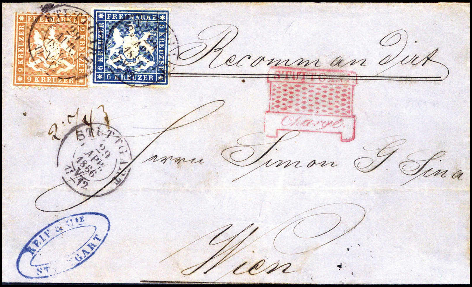 9 Kr., Mischfrankatur mit 6 Kr. dunkelblau (diese ob. kl. Randunebenheit) auf gef., rekommandiertem Brief mit klarem K2 STUTTGART 29/4 66 nach Wien, beiges. roter Kamin-Chargéstempel, Fotobefund Heinrich BPP