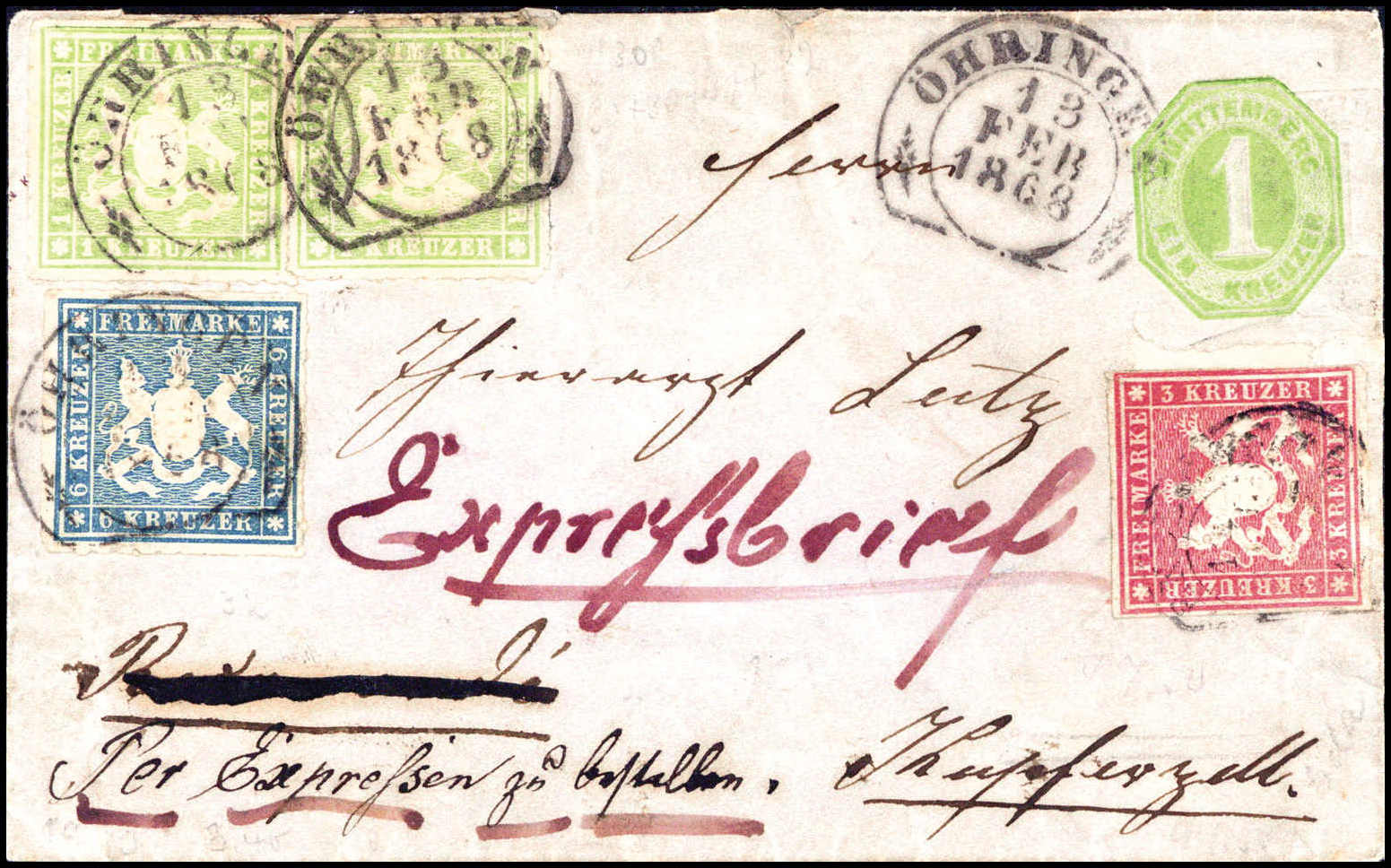 1 Kr., zwei Exemplare mit 6 Kr. hellblau und einer später hinzugefügten 3 Kr. rosa auf Ganzsachenumschlag 1 Kr. grün als äußerst seltener Expressbrief mit Steigbügelstempel ÖHRINGEN 13/2 68 nach Kupferzell. Obwohl etwas fehlerhaft, ein