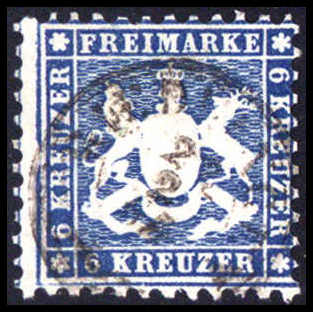 6 Kr. dunkelblau, Plattenfehler I (Halbmond), Kabinettstück mit K3 RIEDLINGEN, Fotobefund Heinrich BPP ("In dieser schönen Erhaltung sehr selten!"). Katalogpreis: 600,-+