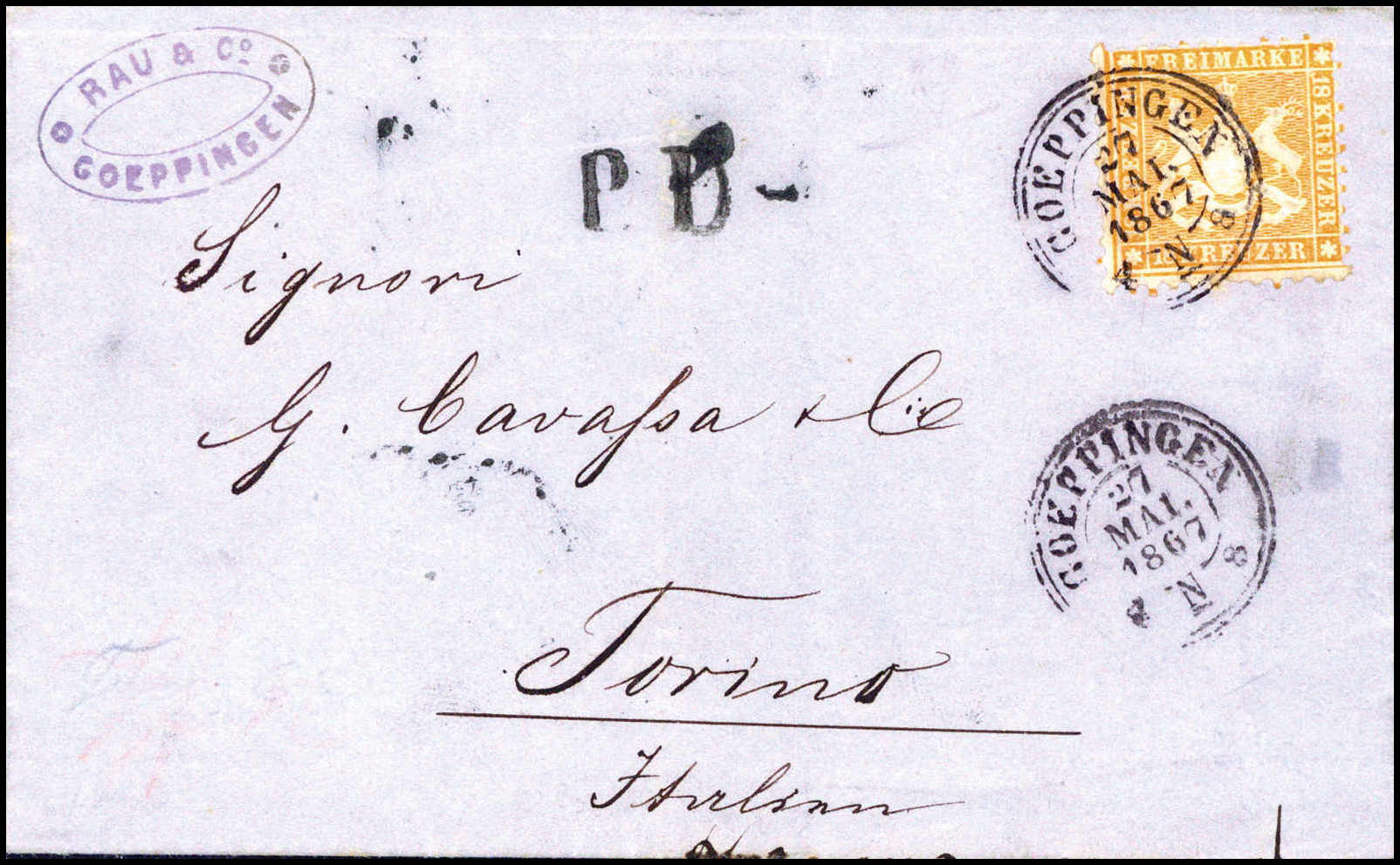 18 Kr., üblich gezähntes Prachtstück mit sauber aufges. K3 GOEPPINGEN 27/5 67 auf blauem Faltbrief nach Italien. Seltene Einzelfrankatur. Katalogpreis: 2.500,-