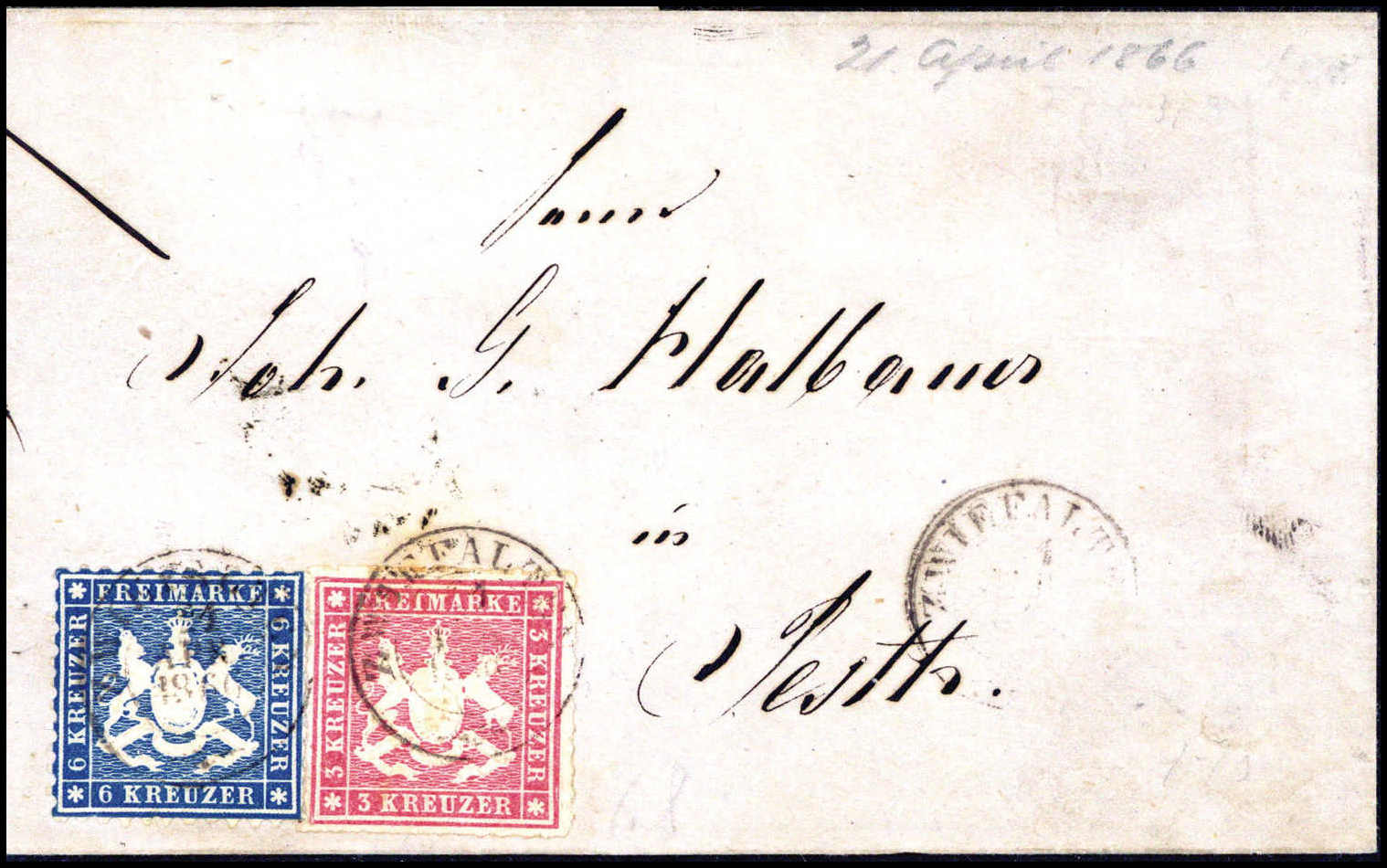 6 Kr. dunkelblau, Mischfrankatur mit 3 Kr. rosa, durchstochen, auf schönem Kabinettbrief mit klaren K2 ZWIEFALTEN 21/4 66 nach Pesth. Eine seltene Kombination