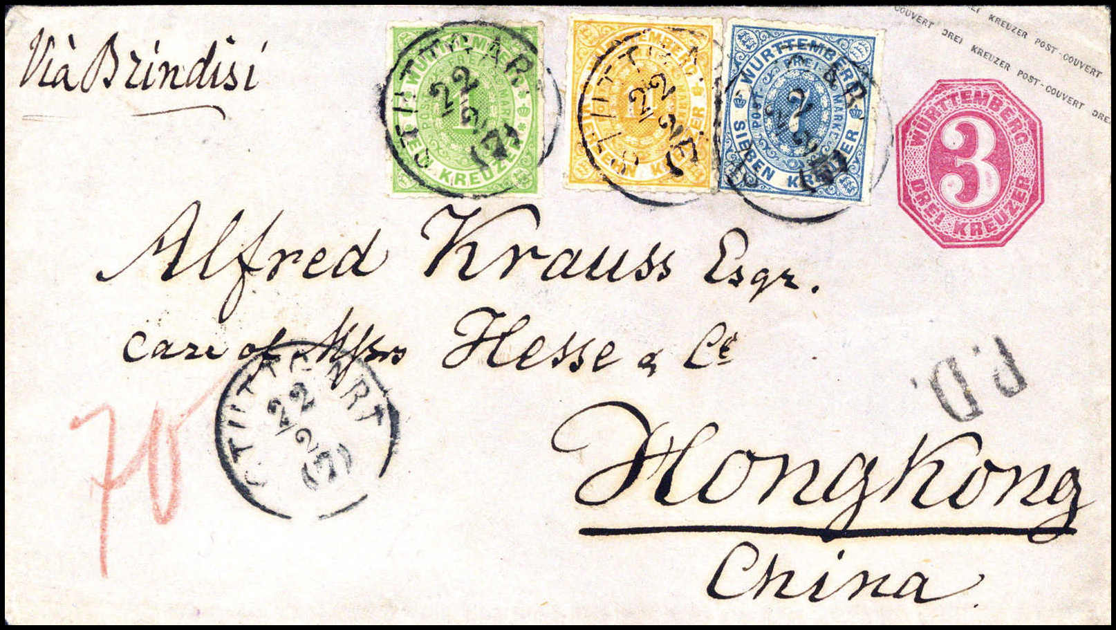 Vierfarbenkombination nach China: 1 Kr. grün, 7 Kr. blau und 14 Kr. gelborange auf Ganzsachenumschlag 3 Kr. karmin mit zentrischen K1 STUTTGART 22/2 (1872) via Brindisi nach Hongkong/China. Alle Marken in leuchtend frischen Farben und