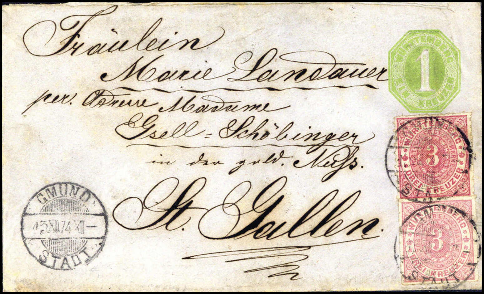 3 Kr. hell- und dunkelrosa, zwei Kabinettstücke in stark unterschiedlichen Farbnuancen auf Ganzsachenumschlag 1 Kr. grün nach St.Gallen (oben etwas unreg. geöffnet), zentr. Stempel GMÜND STADT 15/12 74