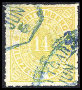 14 Kr. zitronengelb, Kabinettstück mit blauem Fächerstpl. STUTTGART II. Eine seltene Marke in perfekter Erhaltung, Fotoattest Heinrich BPP. Katalogpreis: 2.000,-