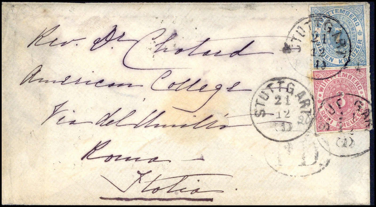 3 Kr. mit 7 Kr. hellblau auf kl. Brief mit K1 STUTTGART 21/12 (1872) nach Rom (Beförd.-Spuren)