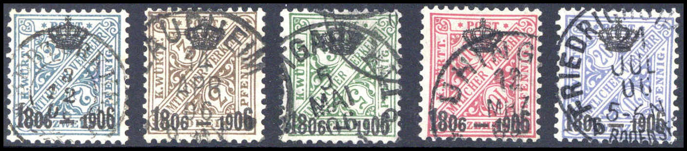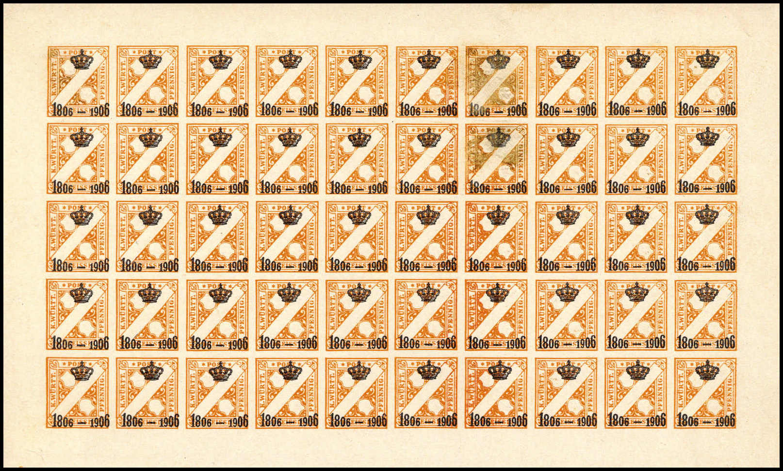 Originalbogen der Aufdruck-Probe Krönchen-Aufdruck "1806-1906" orange, ohne Wertziffer und schwarzer Inschrift in ungummierten Halbbogen zu 50 Marken von der Original-Druckplatte. Drei Marken etwas verfärbt, sonst in tadelloser Erhaltung.