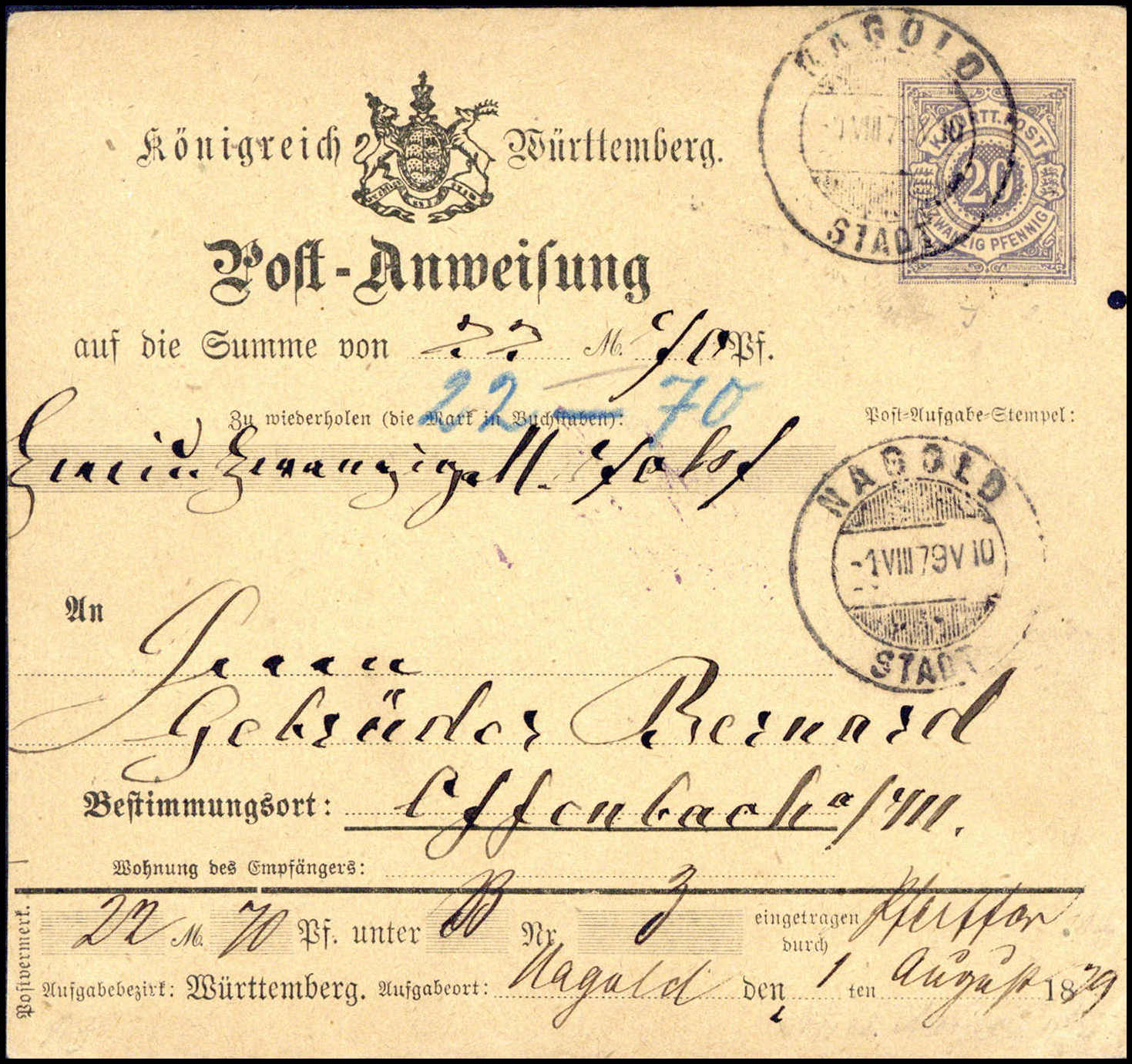 Postanweisung 20 Pfg. mit klarem DB NAGOLD 1/8 79 nach Offenbach, rs. unbedeutende Klebespuren, Fotoattest Winkler BPP