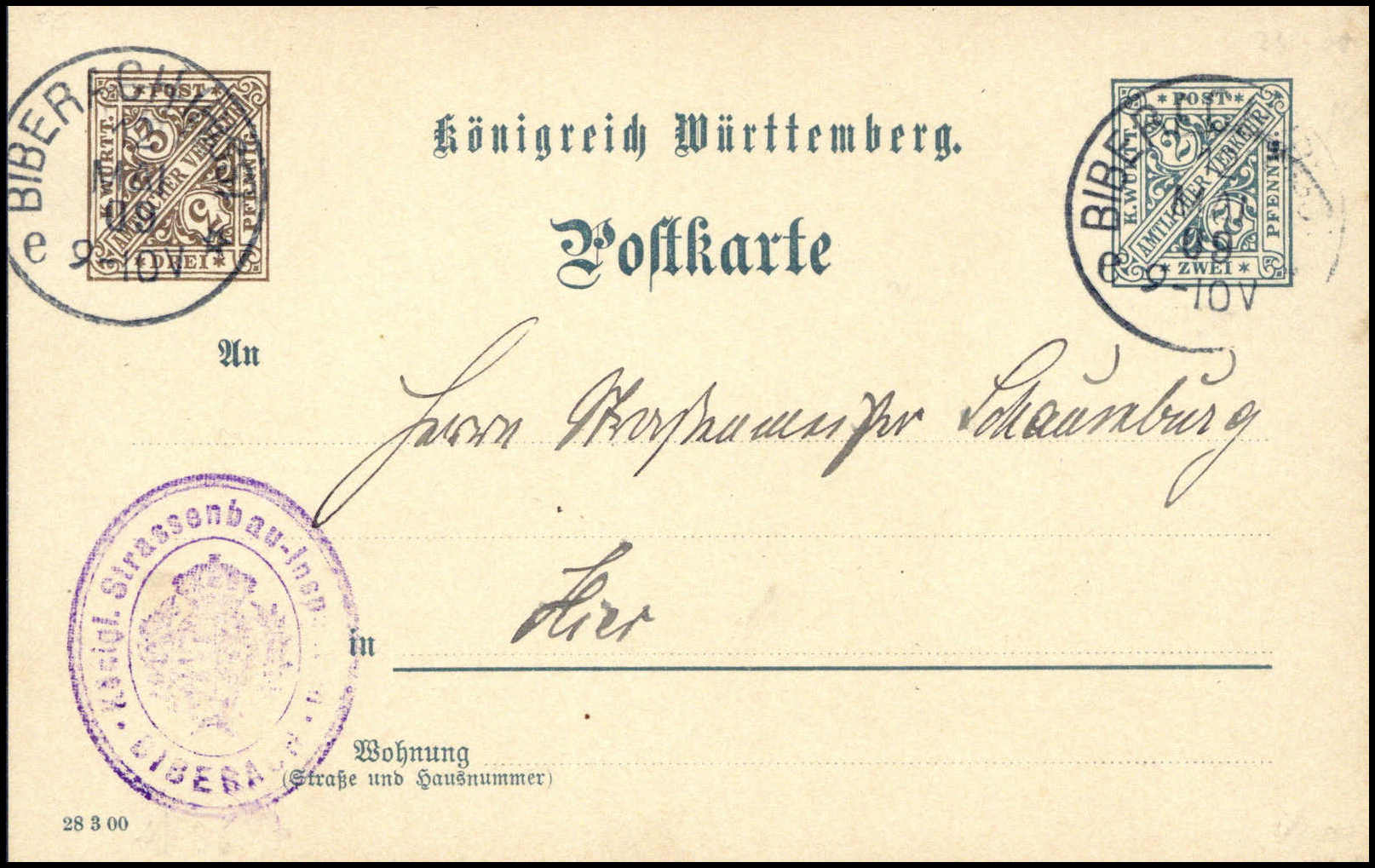 3 Pfg. neben 2 Pfg., Karte für den Dienstverkehr der Staatsbehörden 1908, tadellos mit klarem K1 BIBERACH 12/5 09, Fotoattest Winkler BPP ("... ist auch überfrankiert wie hier sehr selten")