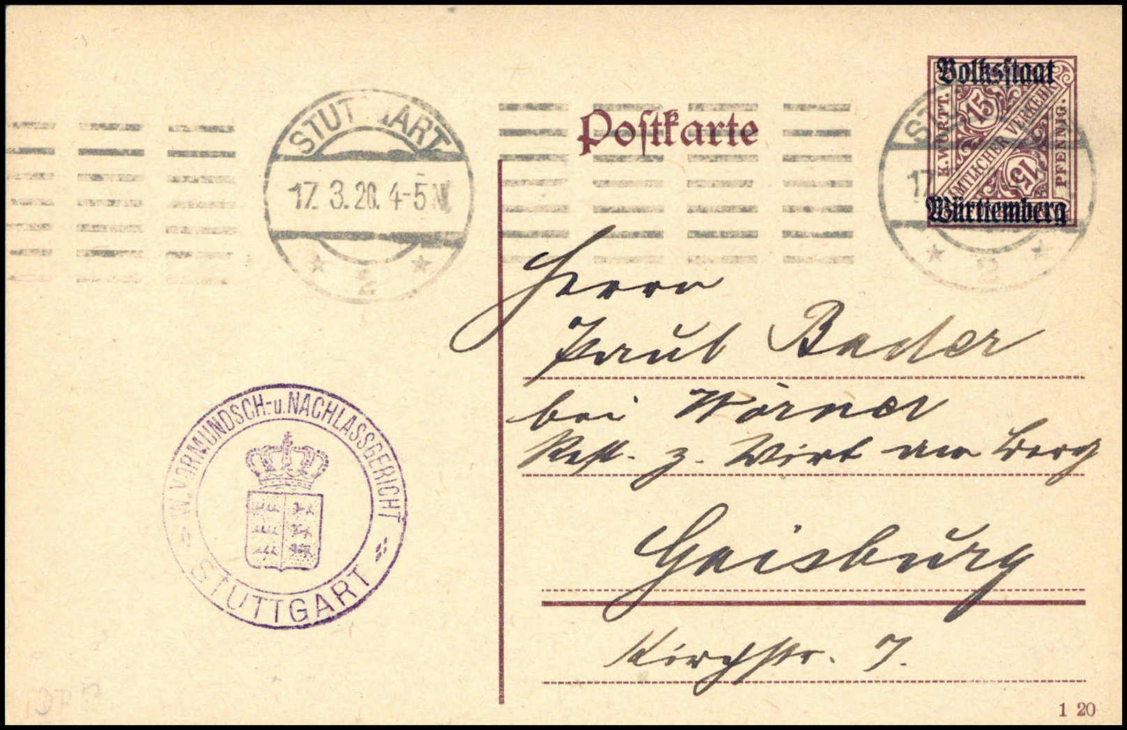 15 Pfg., überfrankierte Bedarfskarte mit klarem Maschinenstempel STUTTGART 17/3 20 und beiges. Dienstsiegel des Stuttgarter Nachlassgerichts nach Gaisburg. Sehr selten, da die Verwendungszeit weniger als drei Monate betrug, Fotoattest