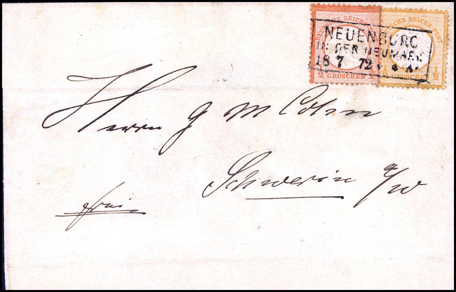 ½ Gr. ziegelrot in Mischfrankatur mit ½ Gr. orange, beide kl. Schild, Kabinettstücke mit zentr. R3 NEUENBURG IN OLDENBURG 18/7 72 auf frischem, weißem Faltbrief nach Schwerin. Eine extrem seltene Frankatur-Kombination, Fotoattest Hennies