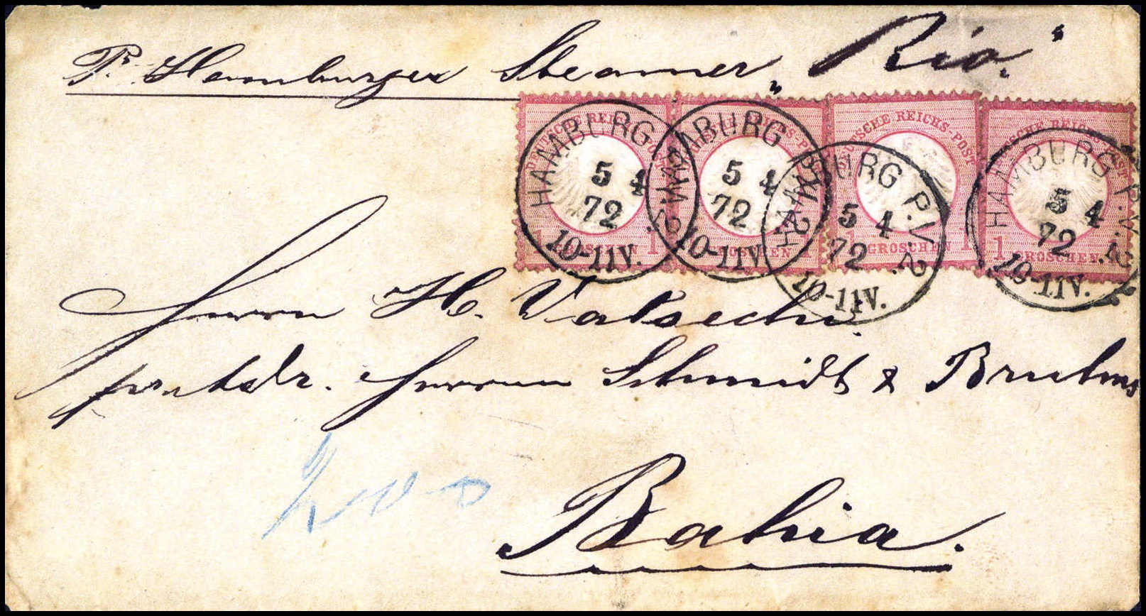 1 Gr., vier Kabinettstücke mit klaren K1 HAMBURG P.V. 2 5/4 72 auf schönem Brief (leichte Patina) nach Bahia/Brasilien. Oben mit Leitvermerk "Pr. Hamburger Steamer Rio", unten mit brasil. Taxierung "200" und rs. Ak.-Stempel vom 30.4.1872