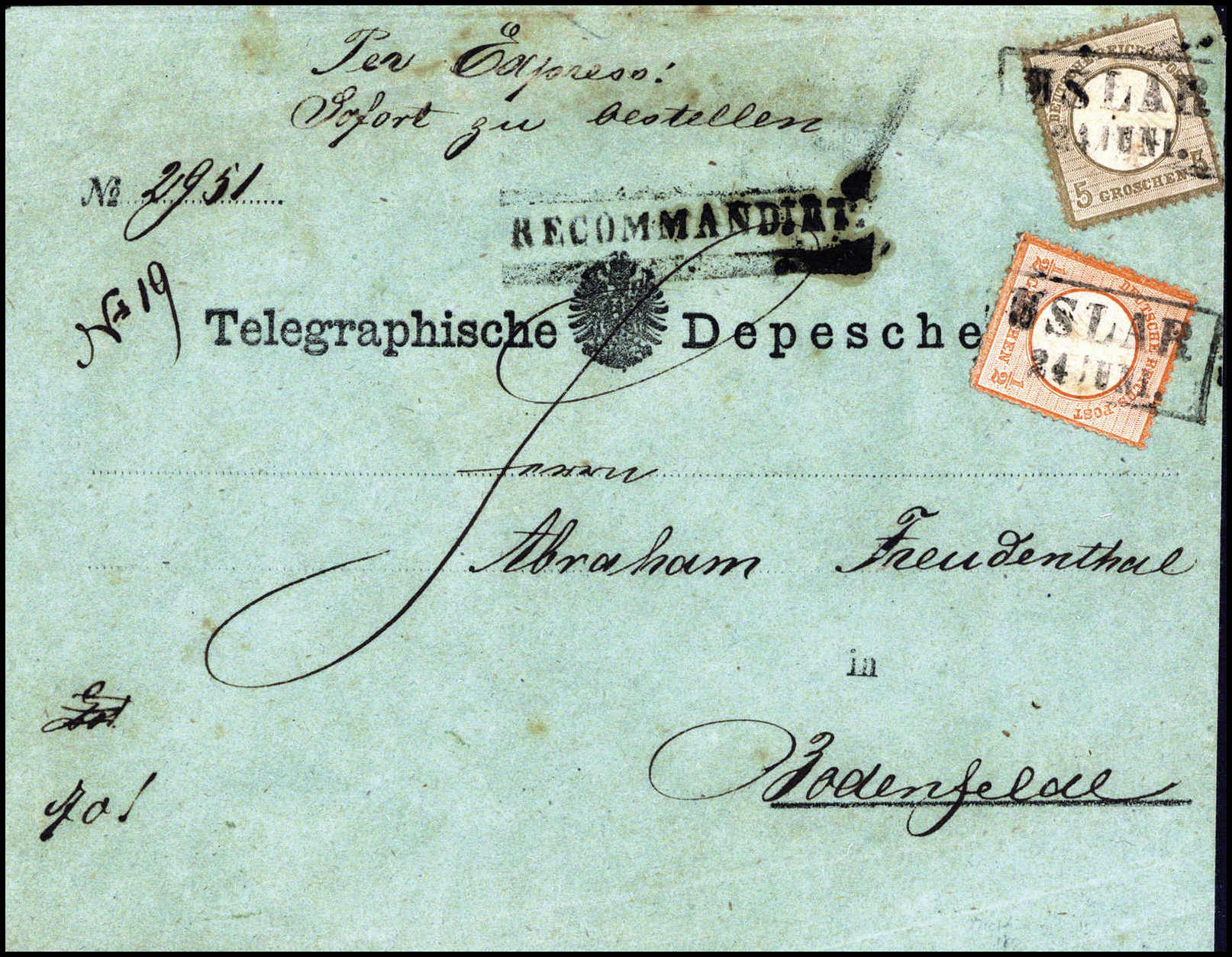 ½ Gr. mit 5 Gr. ockerbraun als tarifmäßige 5½ Gr.-Frankatur auf grünem Vordruckumschlag "Telegraphische Depesche" und Vermerk "per Express, sofort zu bestellen" mit klaren Hannover-R2 USLAR nach Bodenfelde, beiges. R1 RECOMMANDIRT.