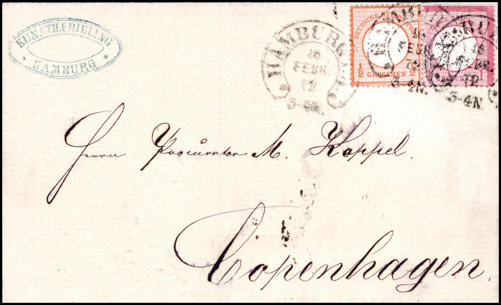 ½ Gr. mit 1 Gr. karminrosa auf schöner, weißer Drucksache nach Kopenhagen, Hufeisenstpl. HAMBURG I.A. 16/2 72 (Sp.17-2), Fotobefund Krug BPP