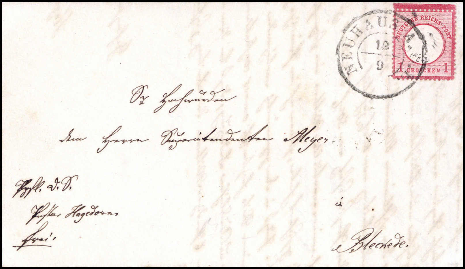 1 Gr., Kabinettstück, oben mit Teil des Bogenrandes als Einzelfrankatur auf sauberem Brief mit Hannover-K2 NEUHAUS, Fotobefund Sommer BPP