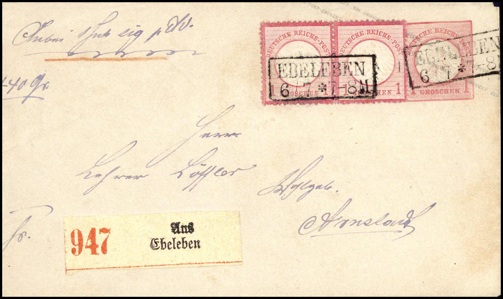 1 Gr., waagr. Luxuspaar auf Ganzsachenumschlag 1 Gr. rosa mit klarem R2 EDELEBEN als Paketbegleitbrief nach Arnstadt, Fotobefund Sommer BPP