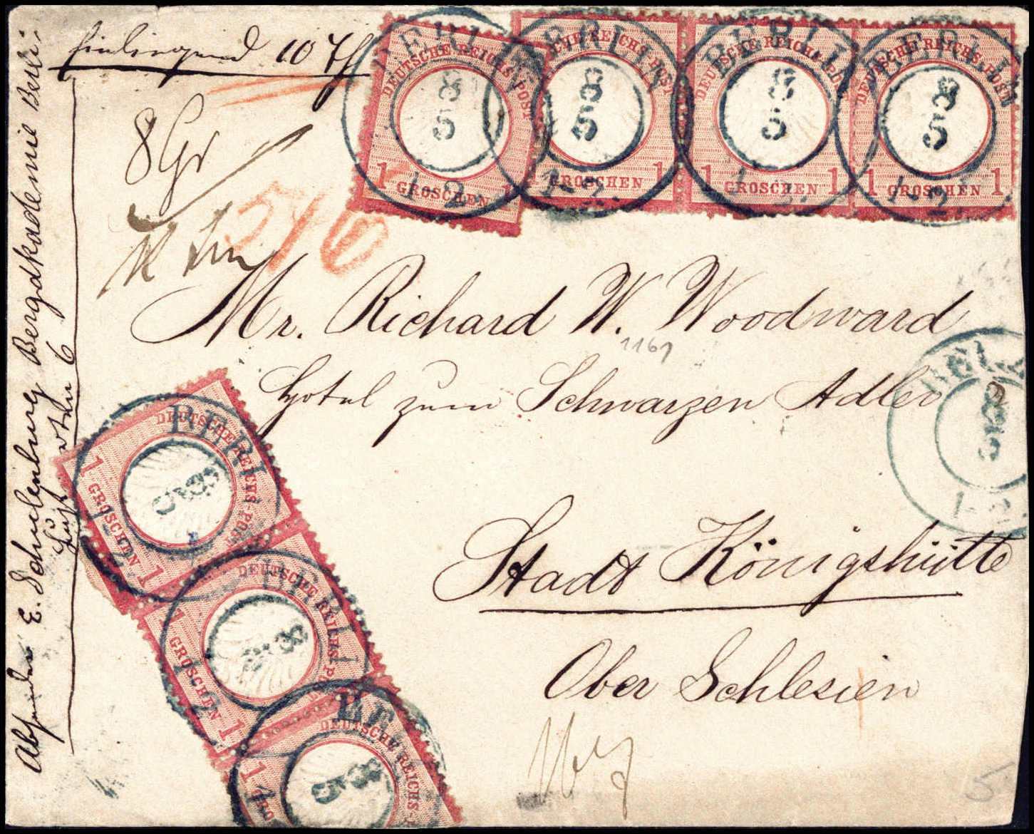 1 Gr., waagr. Paar und Dreierstreifen sowie zwei Einzelstücke (eine Marke re. bestoßen, eine andere um den Briefrand geklebt) auf Wertbrief über 10 Th. nach Königshütte, seltene Entwertung durch leuchtend blaue K2 BERLIN. Ein